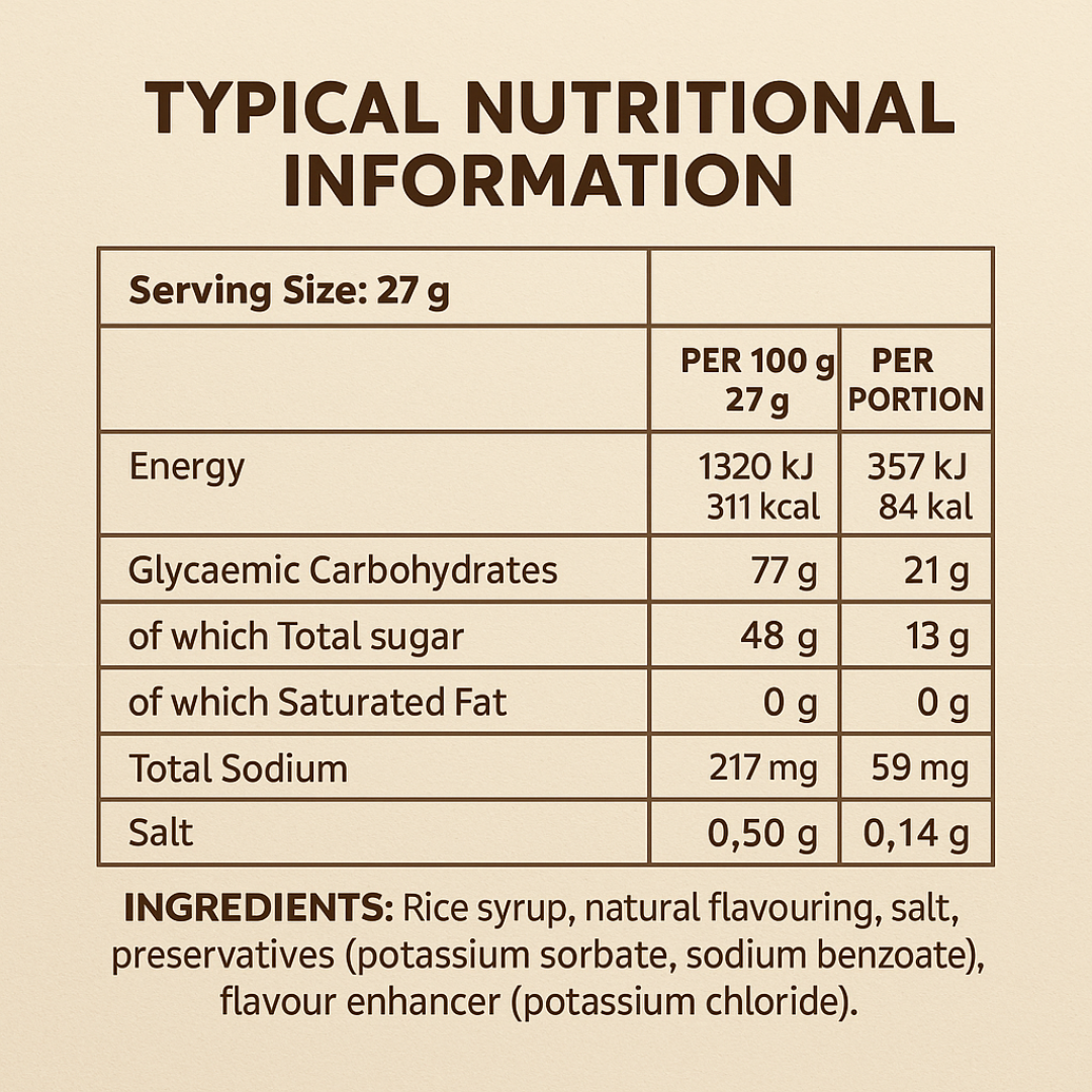 - Pure Brown Rice Syrup – High-quality Non-GMO Brown Rice Syrup, to help deliver smooth energy from start to finish.