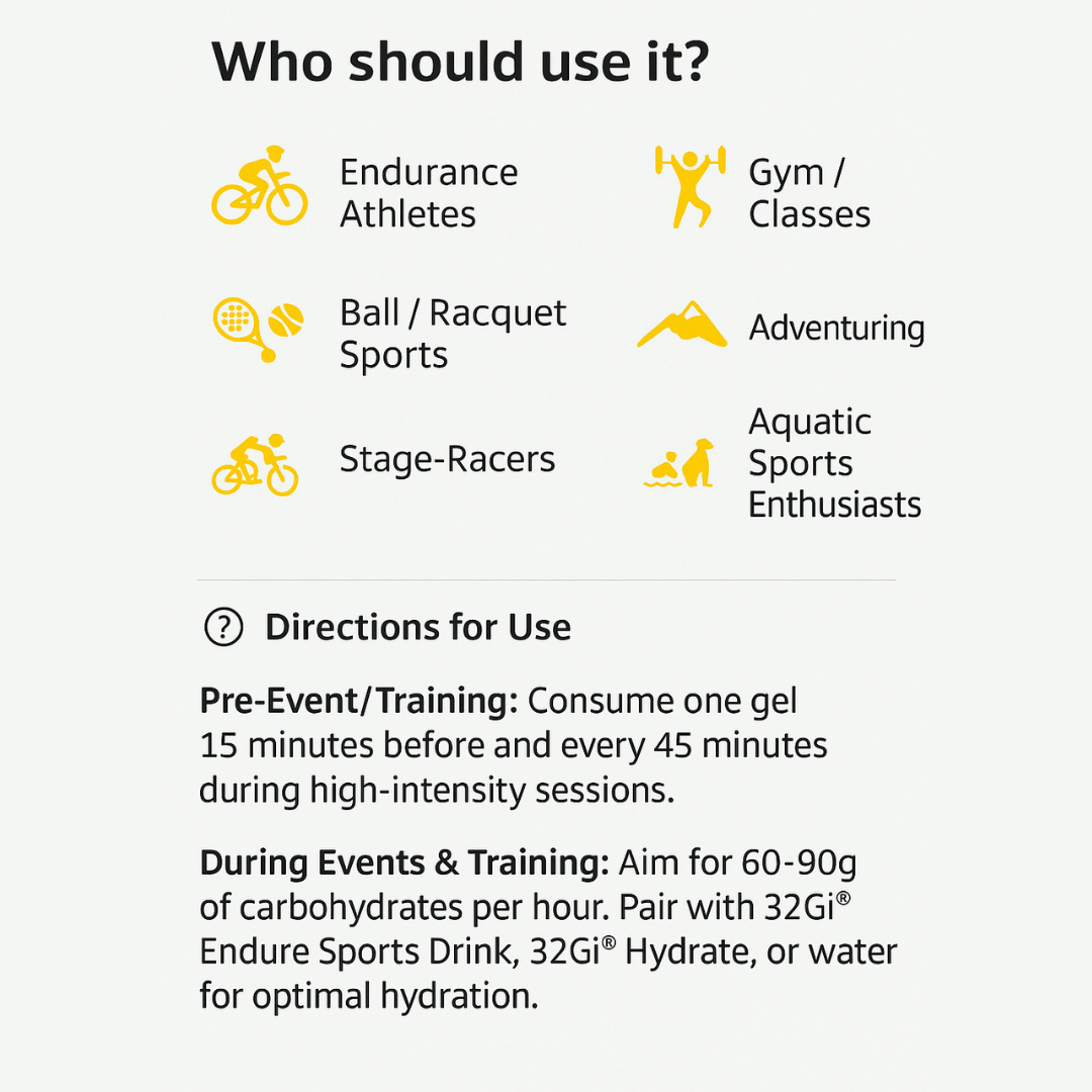 - Fast Acting – 21 g of fast-acting carbohydrates to use on the go. 32Gi Sports Gels help you achieve your fuelling needs for cycling, running – all endurance sports!