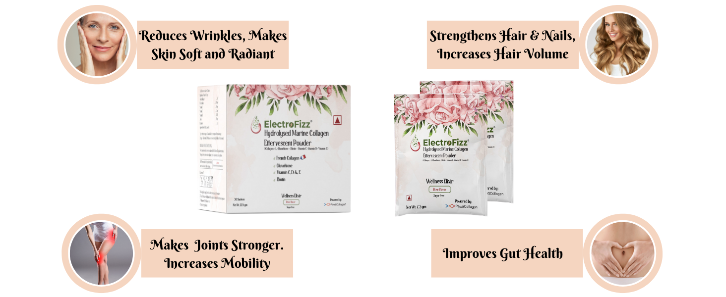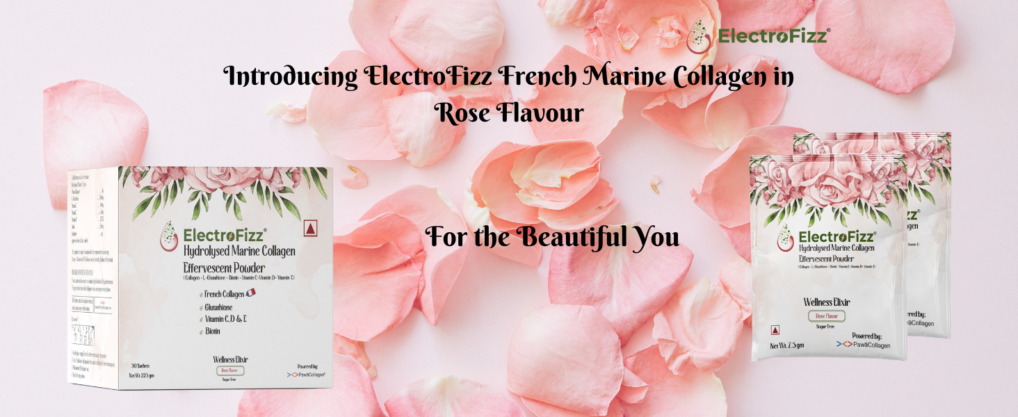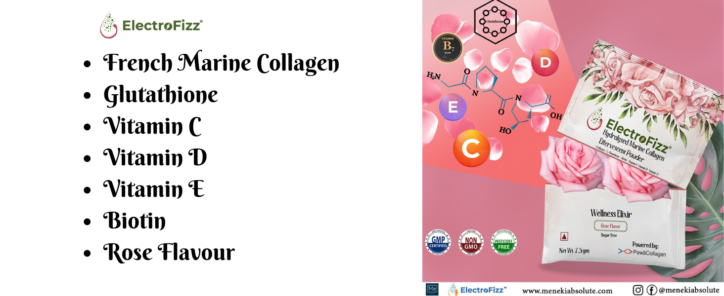 - EectroFizz Rose Collagen for radiant skin and beauty both inside and out. Made with premium french marine collagen peptides, glutathione, and Vitamin D & Vitamin E. For that extra glow, we've added your daily dose of vitamin C and Biotin. Collagen Peptide Powder: Collagen, the most abundant protein in our bodies, is vital for overall health and appearance; one serving of ElectroFizz Collagen delivers 5g of marine collagen to help support healthy hair, skin, nail, bones and joints along with added benefits of other nutrients 1st time in the world, rose collagen in effervescent technology to make your drink tasty while its super healthy