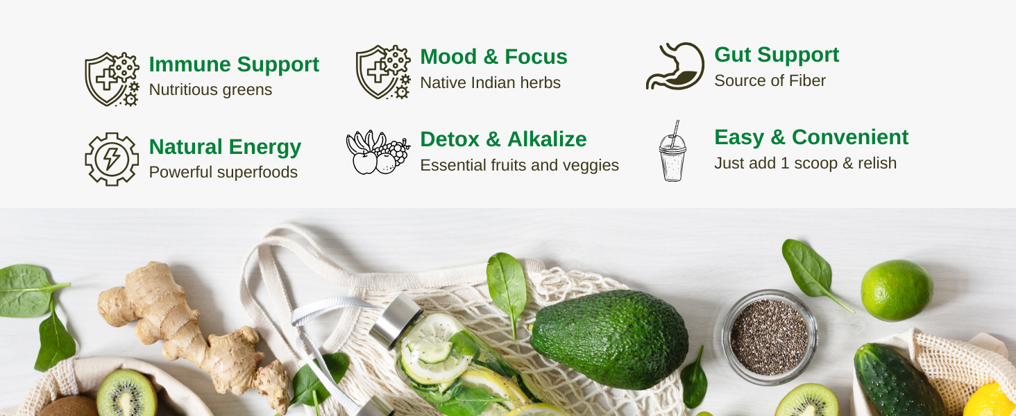 Spirulina, Moringa, Alfalfa, Spinach, Wheatgrass, Bareilly Grass, Basil Leaves, Mint, Ashwagandha, Brahmi, Ginger, Guduchi, Manjistha, Pomegranate, Curcumin, Carrot, Orange Peel, Pineapple, Guava, Psyllium Husk, Blueberry, Green Tea, Rose Petals, Strawberry, Magnesium , Vitamin C, Calcium Carbonate, Sodium, Vitamin E, Niacinamide, Zinc , Iron, Vitamin B2, Vitamin B1, Vitamin B6, Vitamin A, Pantothenate Acid, Selenium, Vitamin K3, Folic Acid, Biotin, Vitamin B12,