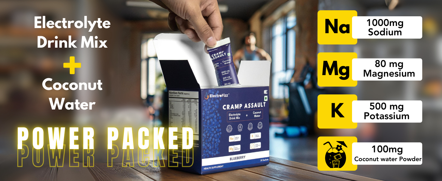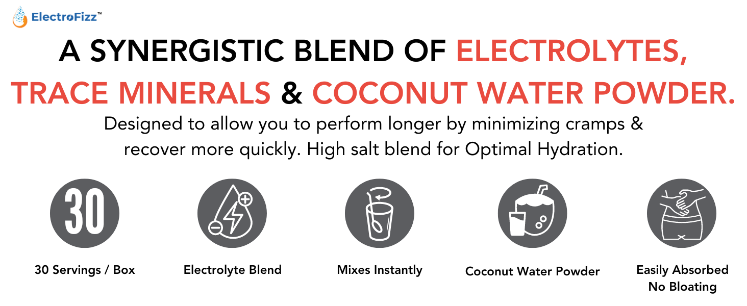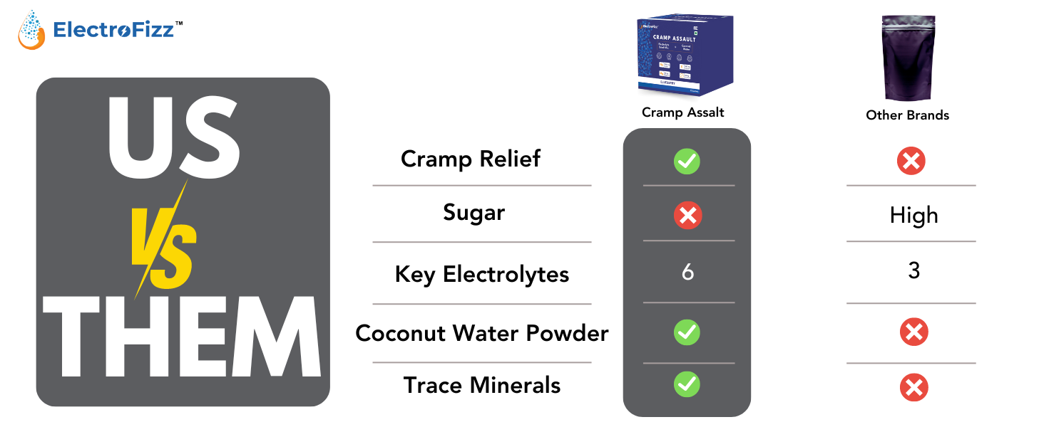 - DESIGNED FOR OPTIMAL PERFORMANCE: ElectroFizz Cramp Assault is a sugar-free electrolyte powder featuring bioavailable electrolytes, trace minerals and coconut water powder to help you stay hydrated throughout the day and during training. Unlike conventional “sports drinks” and many electrolyte powders, our product contains no added sugars or unwanted fillers